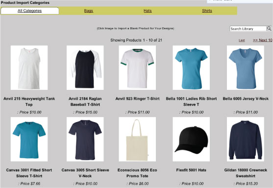 Now with a Gold or Platinum SuperEShops.com Product Template Library you can have access to dozens of pre-defined and loaded sets of blank products, including the most popular brand of imprintable shirts, hats and tote bags, which can be combined with our Product Designer Technology to allow your Store Site to feature Decoration Ideas on many different products quickly and easily.